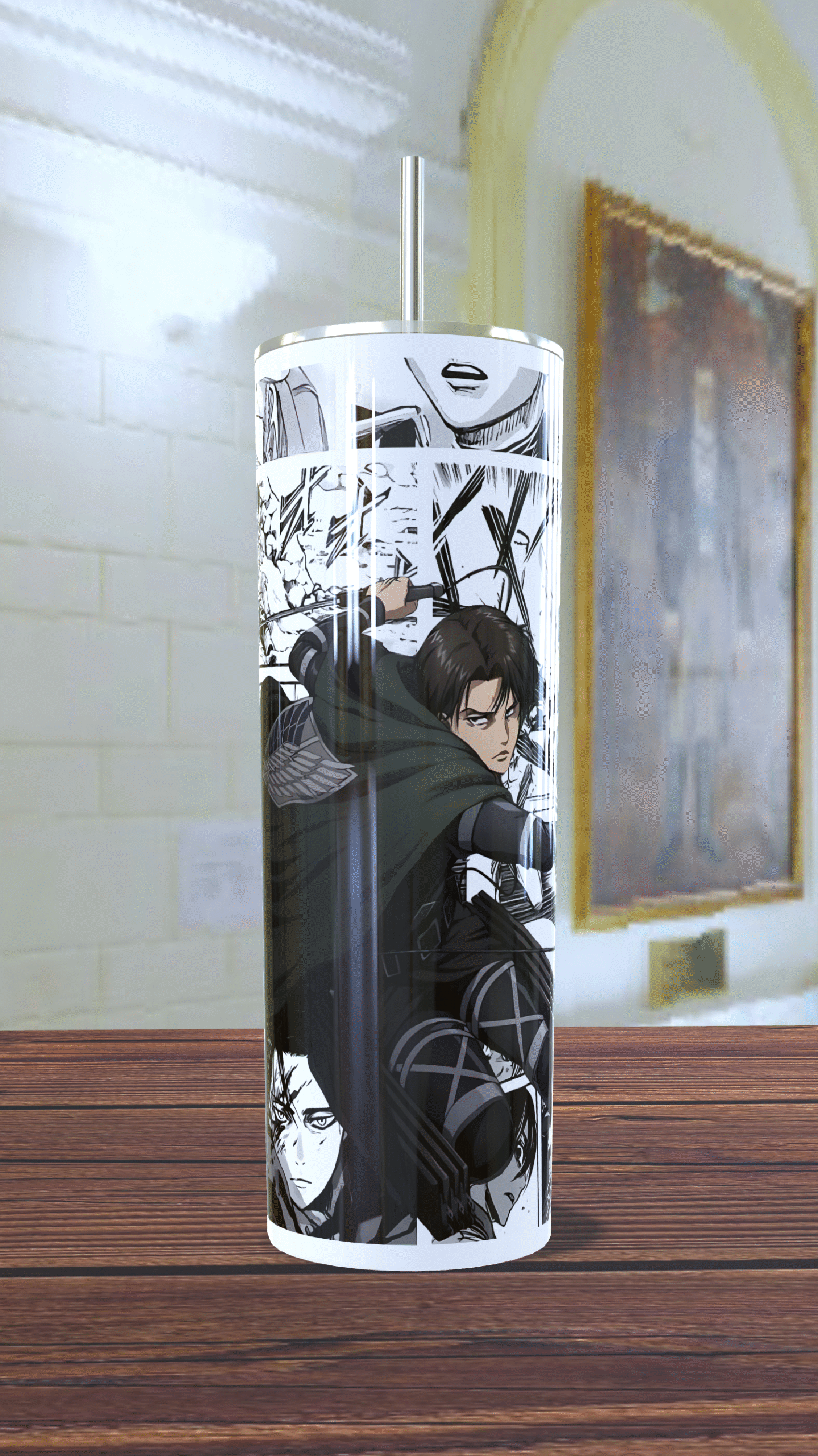 Este termo de 20oz sublimado con la imagen de Levi Ackerman es un homenaje al capitán más letal del Escuadrón de Exploración. Frío como su mirada, pero fiel como su espada: lleva contigo su presencia y mantén tus bebidas a la temperatura ideal mientras limpias el mundo… con café.